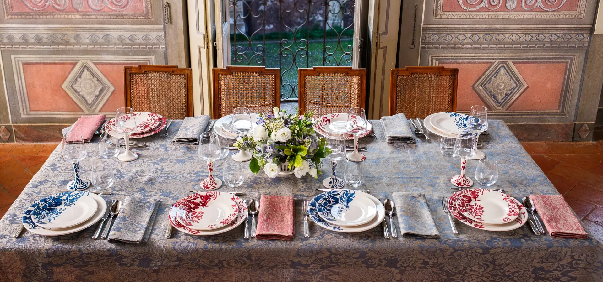 Queste collezioni sono un’esperienza artistica che celebra l’unione indissolubile tra artigianato tessile, arte della ceramica, arte vetraria e l’antica tradizione del peltro. Ogni tovaglia in prezioso lino accoglie piatti e calici in ceramica dipinti a mano e bicchieri artigianali, creati in un dialogo cromatico e grafico unico. Decoro e colore  fluiscono dalla morbidezza del lino alla solidità del piatto, fino al dettaglio inedito dello stelo del calice o del bicchiere.
