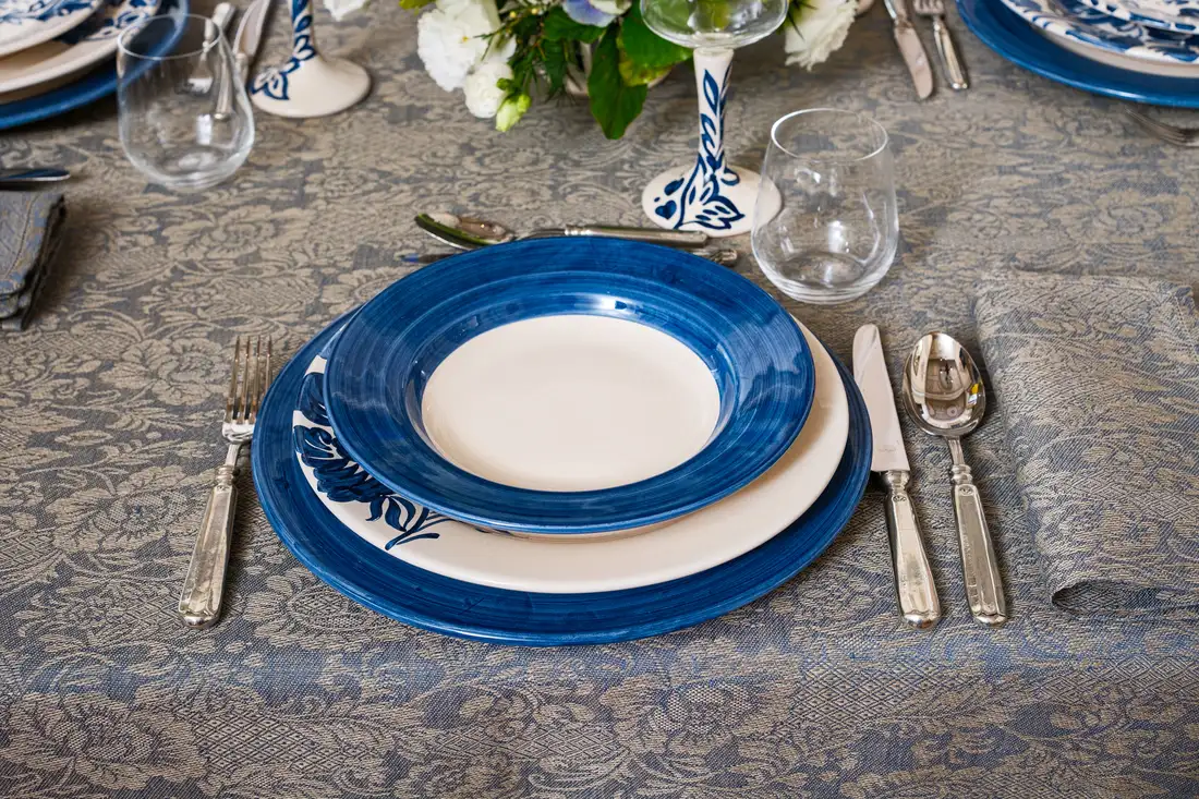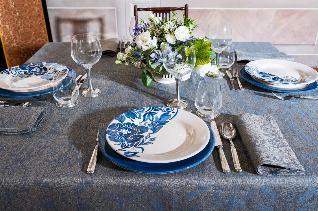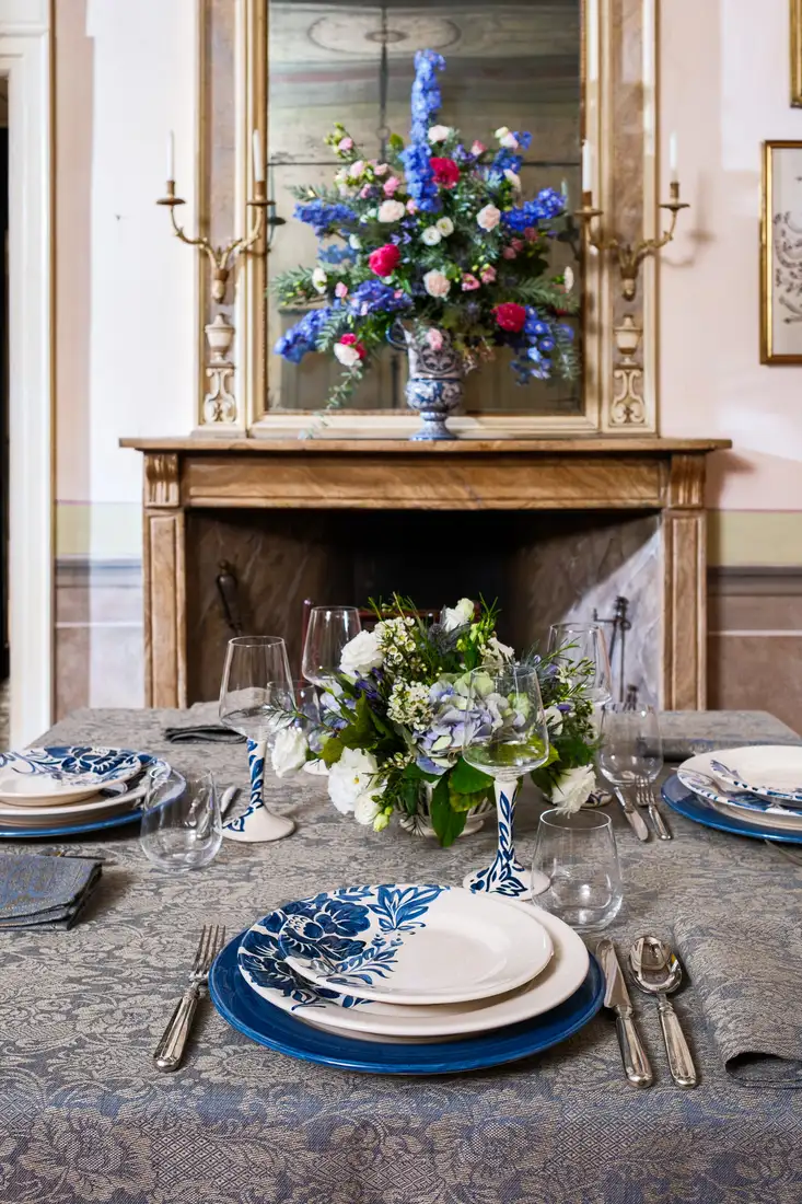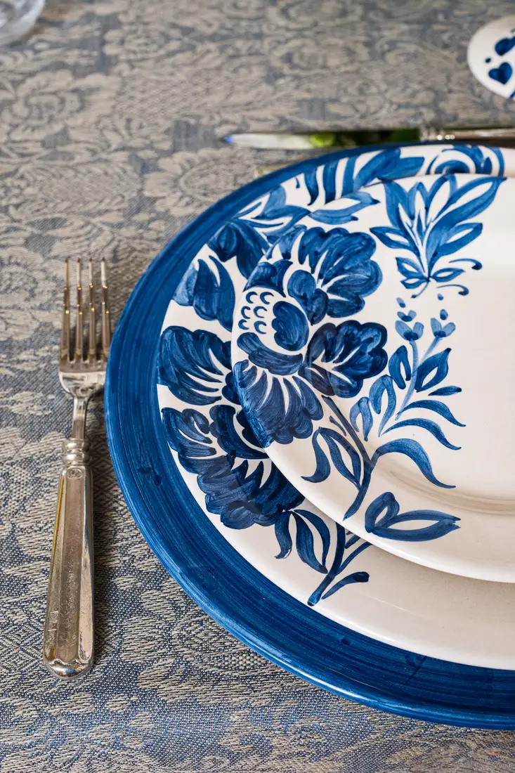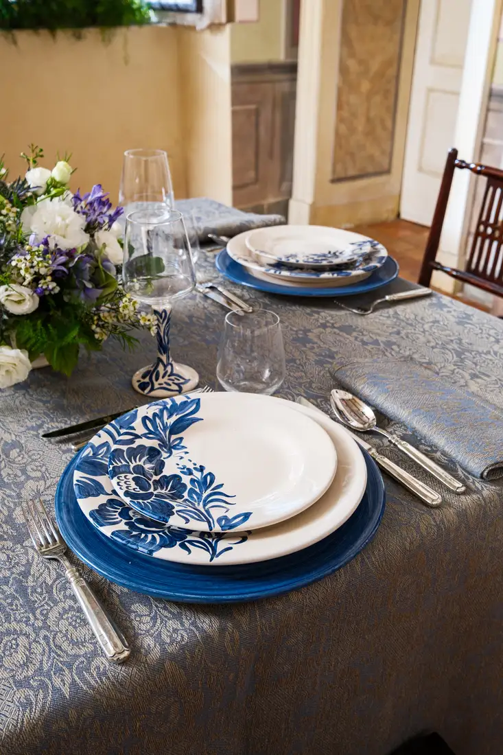Questa elegante collezione, dove la natura diventa arte, รจ un omaggio ai giardini italiani rinascimentali. L’intricata trama della tovaglia in lino intreccia motivi floreali che sembrano scolpiti nel tessuto blu cangiante e che prendono vita inย ogni piatto come una tela, attraverso sapienti pennellate, per poi arrampicarsi lungo gli steli dei calici, trasformando ogni brindisi in un gesto di pura bellezza. Una mise en place che non รจ solo arredo, ma unโarchitettura di stile.