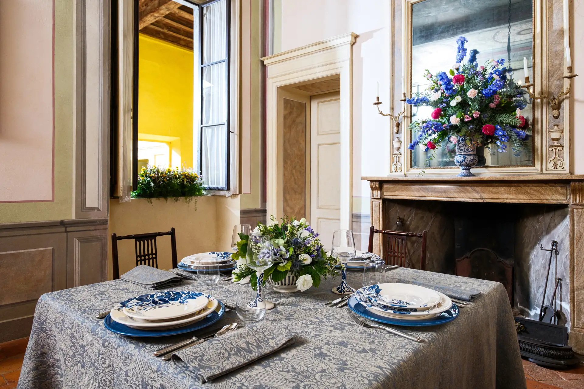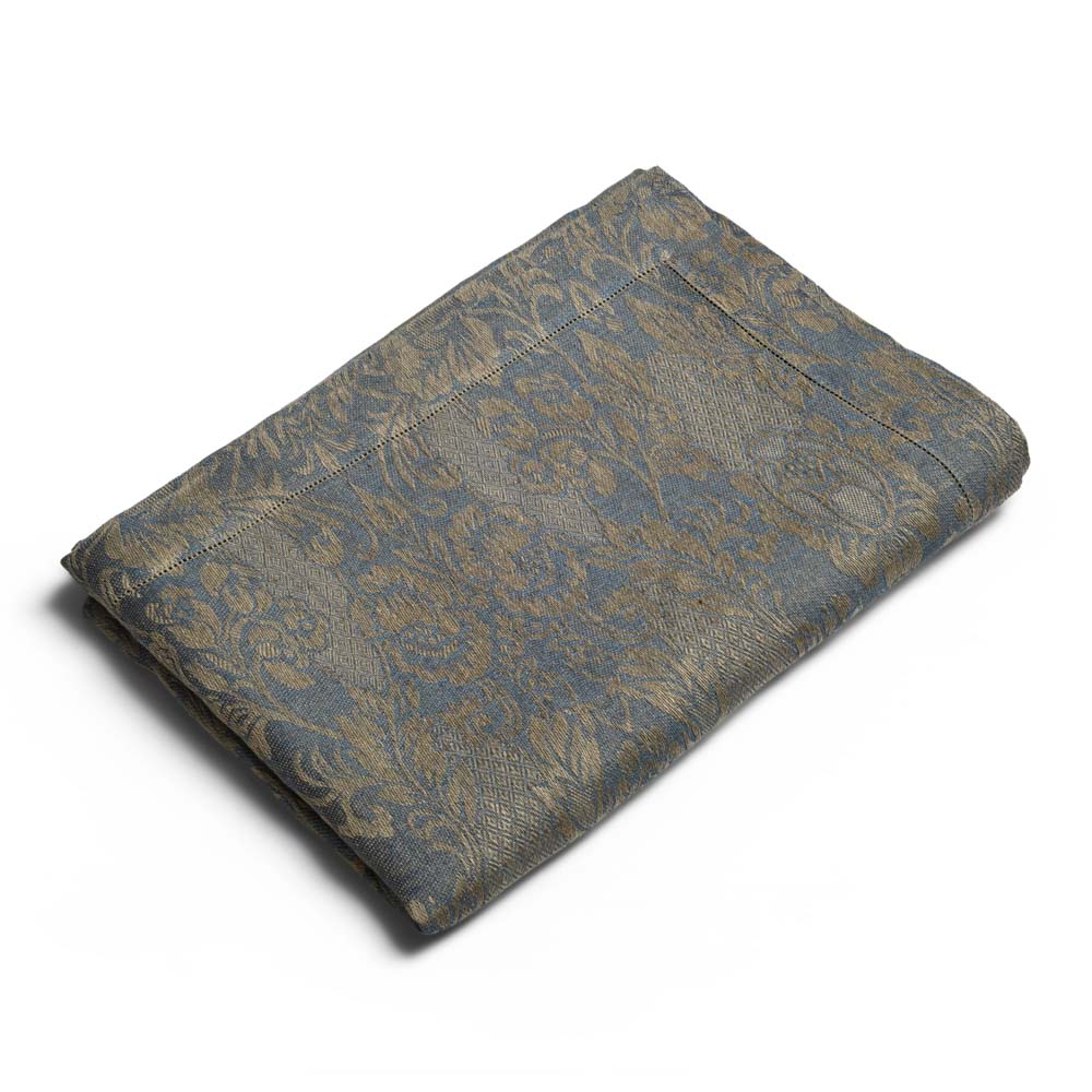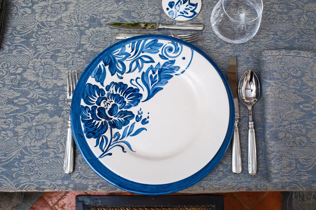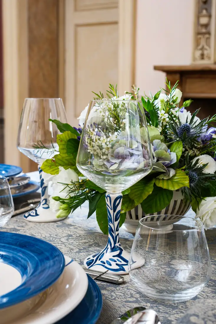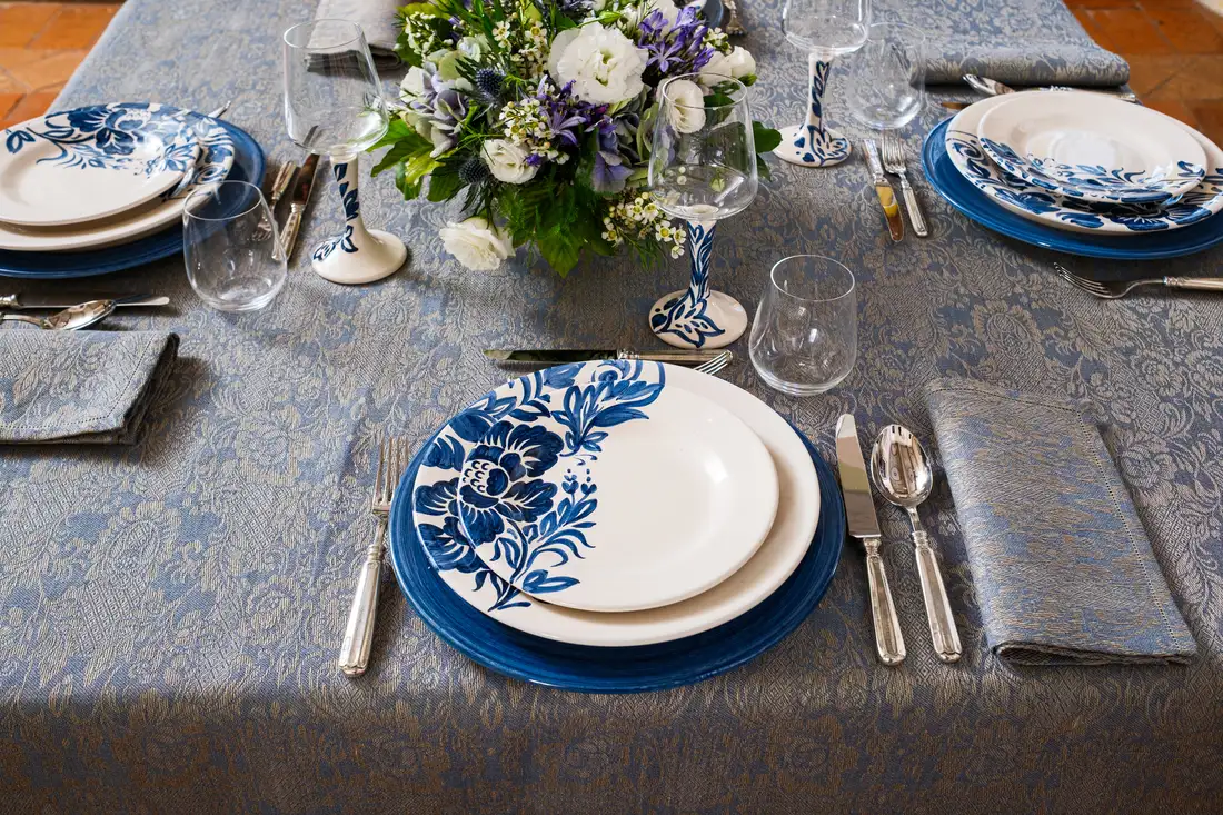 Questa elegante collezione, dove la natura diventa arte, รจ un omaggio ai giardini italiani rinascimentali. L’intricata trama della tovaglia in lino intreccia motivi floreali che sembrano scolpiti nel tessuto blu cangiante e che prendono vita inย ogni piatto come una tela, attraverso sapienti pennellate, per poi arrampicarsi lungo gli steli dei calici, trasformando ogni brindisi in un gesto di pura bellezza. Una mise en place che non รจ solo arredo, ma unโarchitettura di stile.