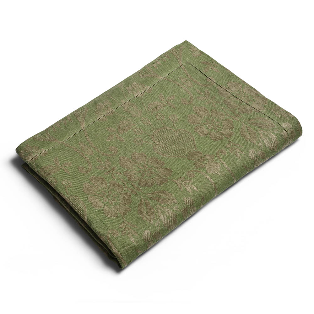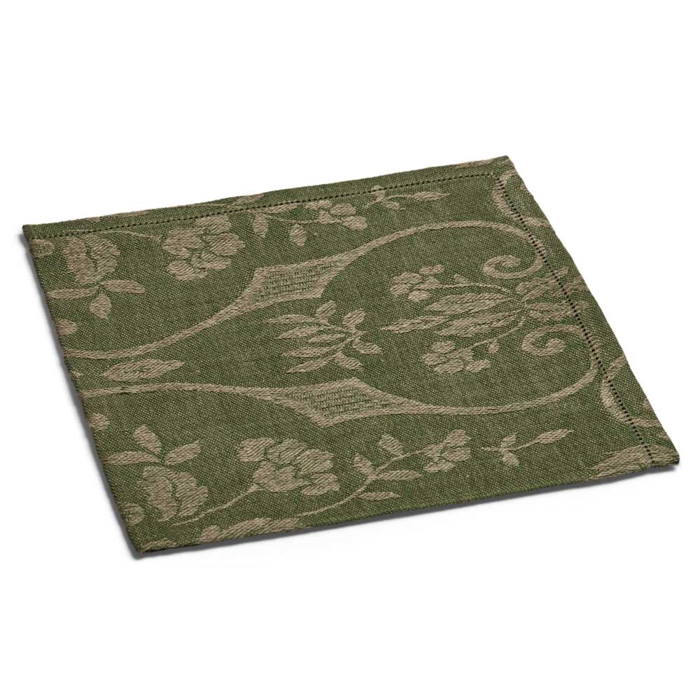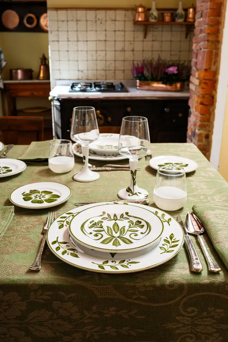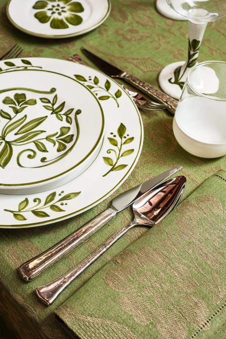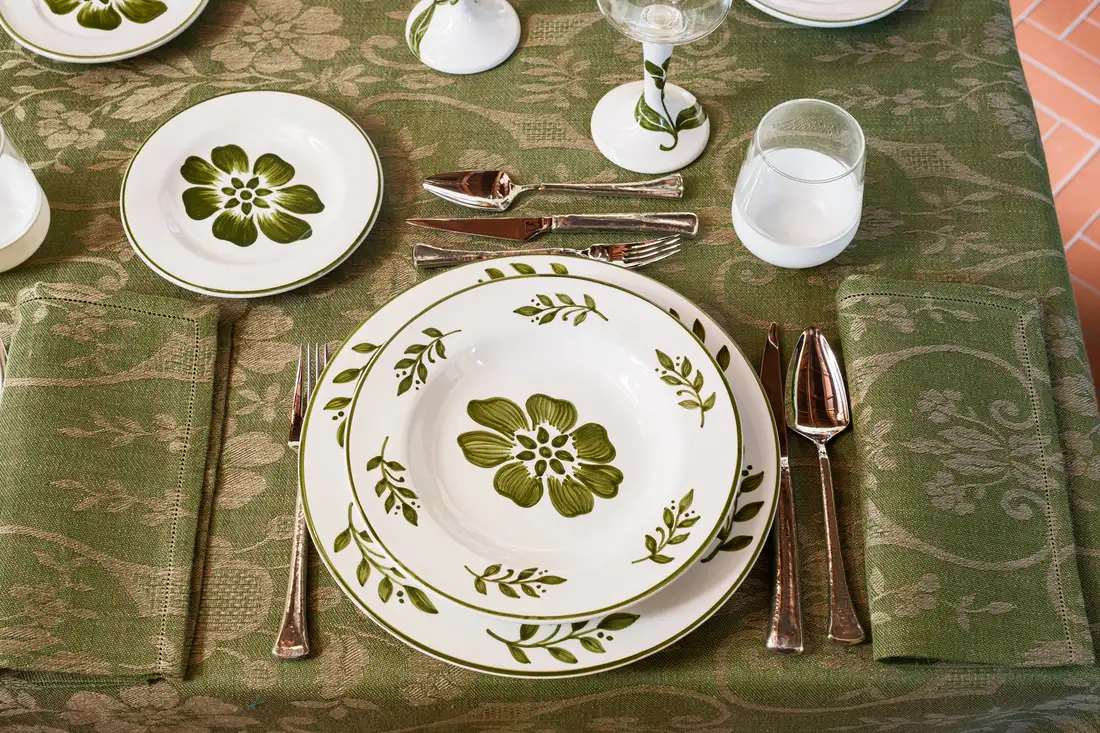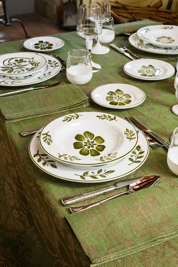 I motivi bucolici che fioriscono sul tessuto jacquard delle tovaglie, si riflettono sullo smalto della ceramica dei piatti e dei bicchieri, creando una tavola che sembra dipinta da un unico artista. Omaggio alla vita lenta e alla bellezza autentica della natura, questa collezione, dal gusto rustico ma chic, ha come protagonista il colore olivaย che esprime il suo massimo nella tonalitร cangiante della tovaglia.