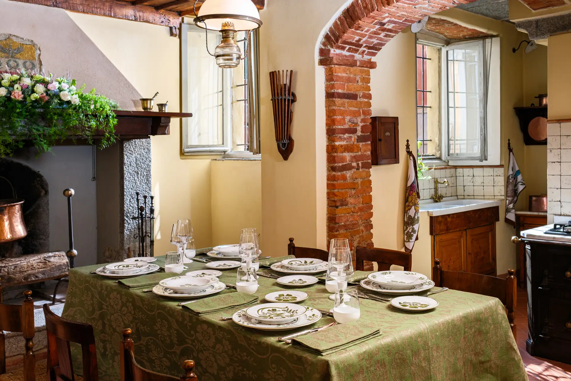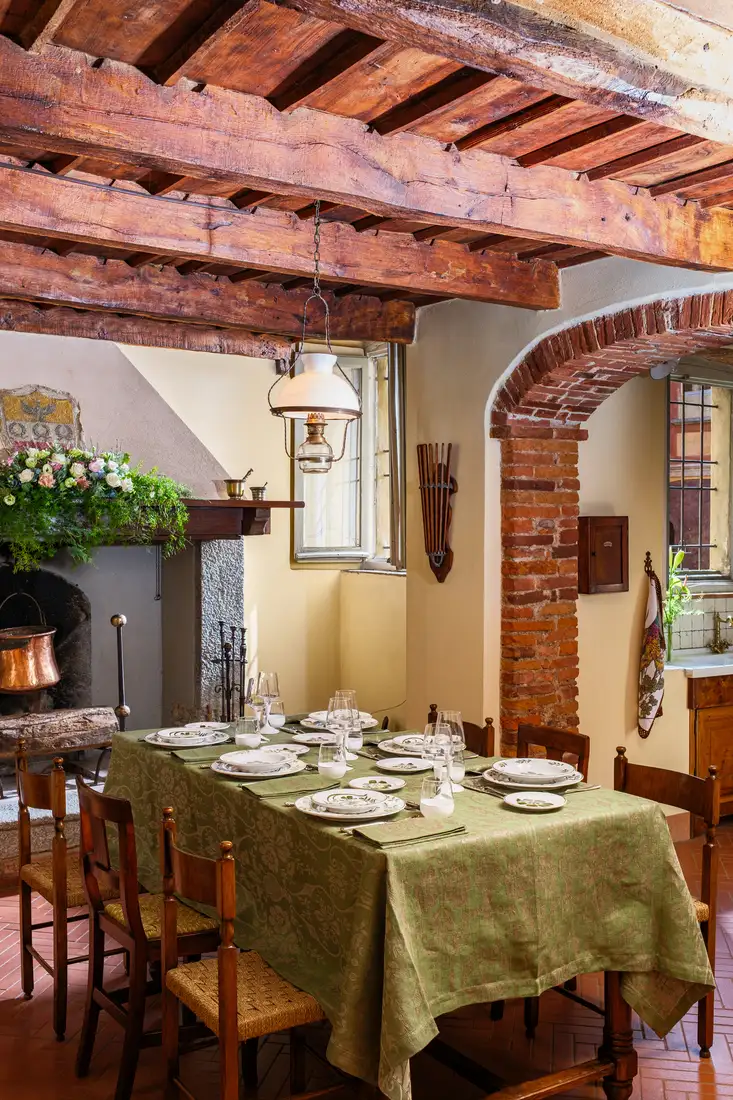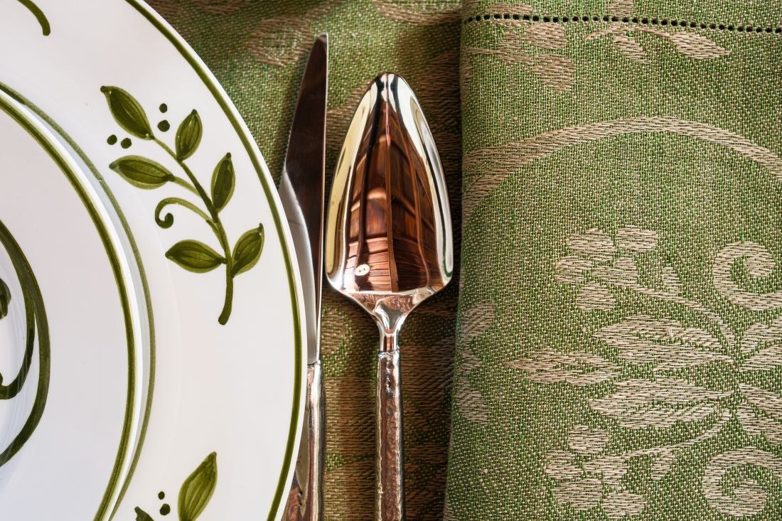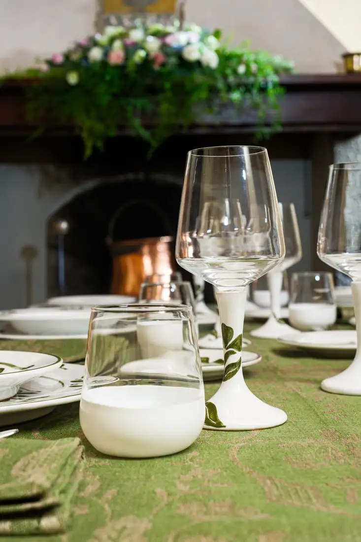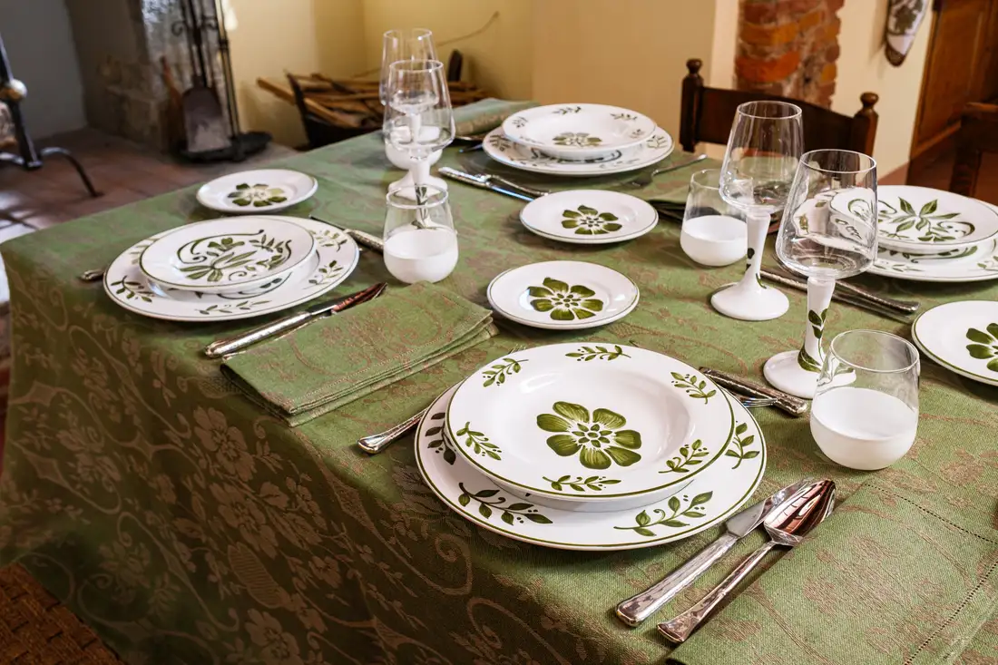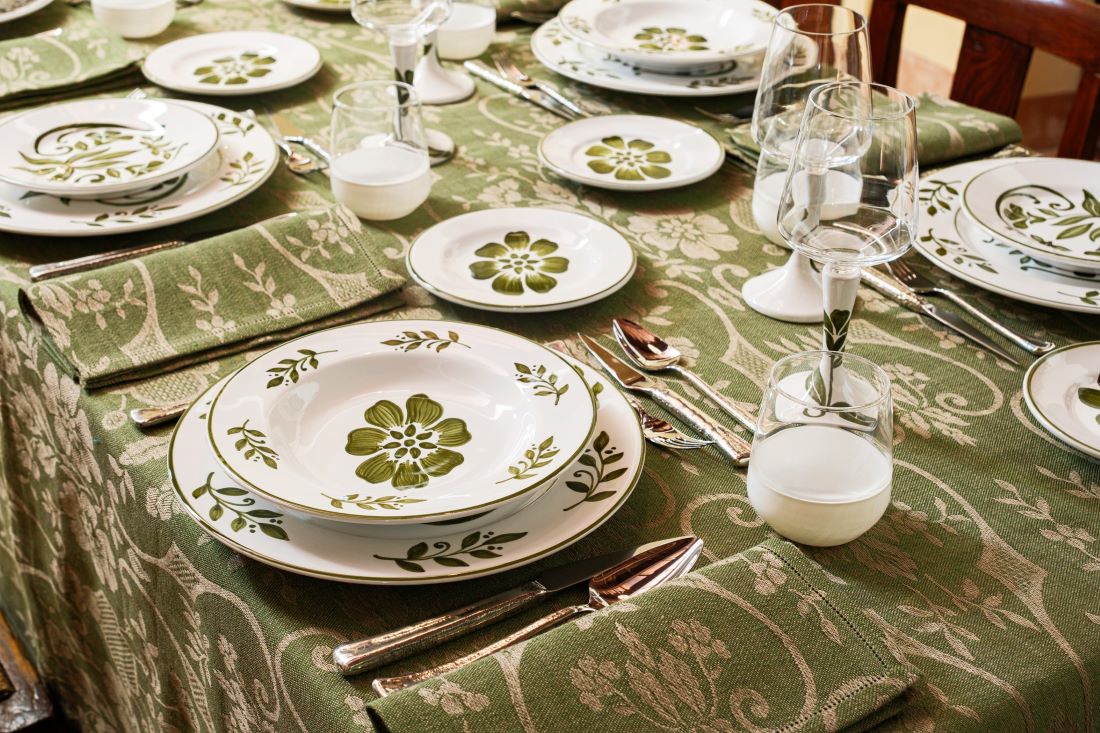 I motivi bucolici che fioriscono sul tessuto jacquard delle tovaglie, si riflettono sullo smalto della ceramica dei piatti e dei bicchieri, creando una tavola che sembra dipinta da un unico artista. Omaggio alla vita lenta e alla bellezza autentica della natura, questa collezione, dal gusto rustico ma chic, ha come protagonista il colore olivaย che esprime il suo massimo nella tonalitร cangiante della tovaglia.