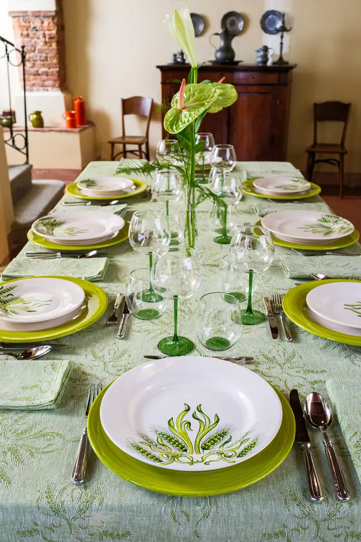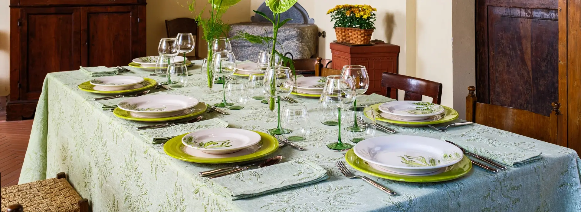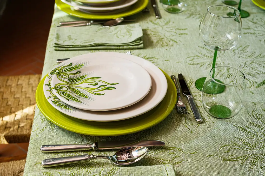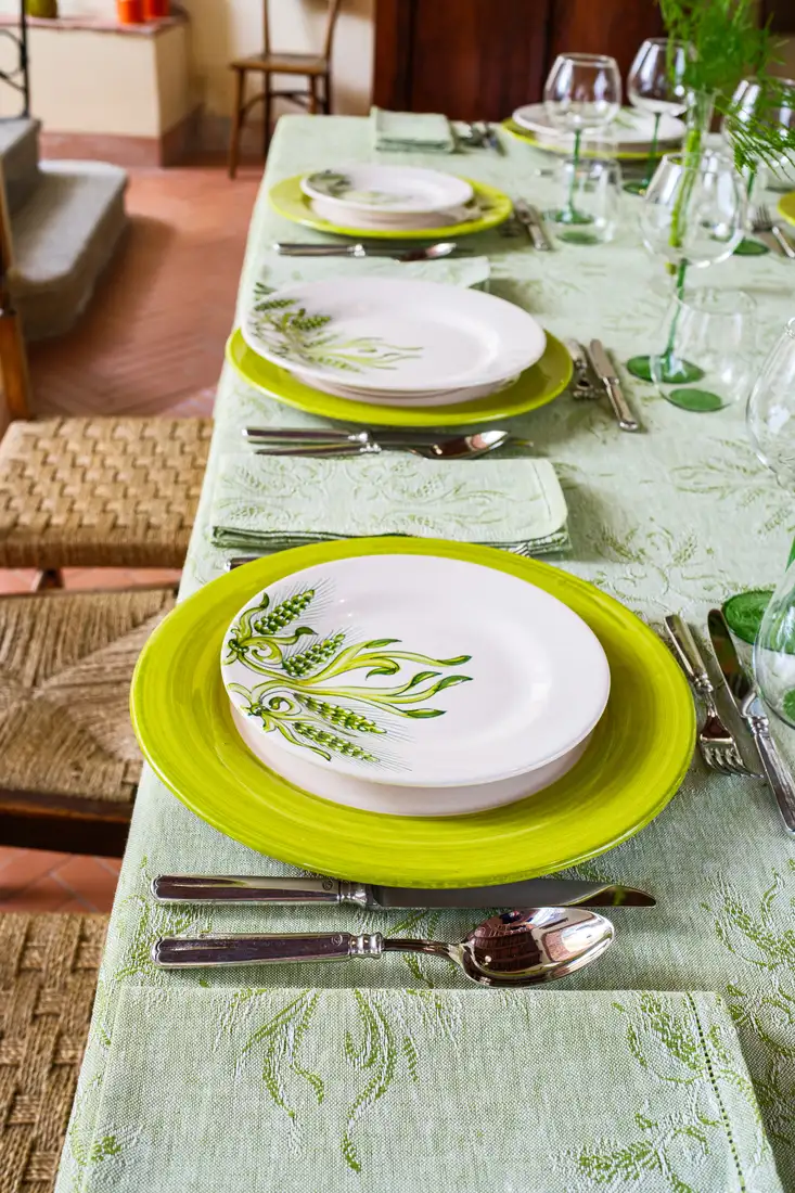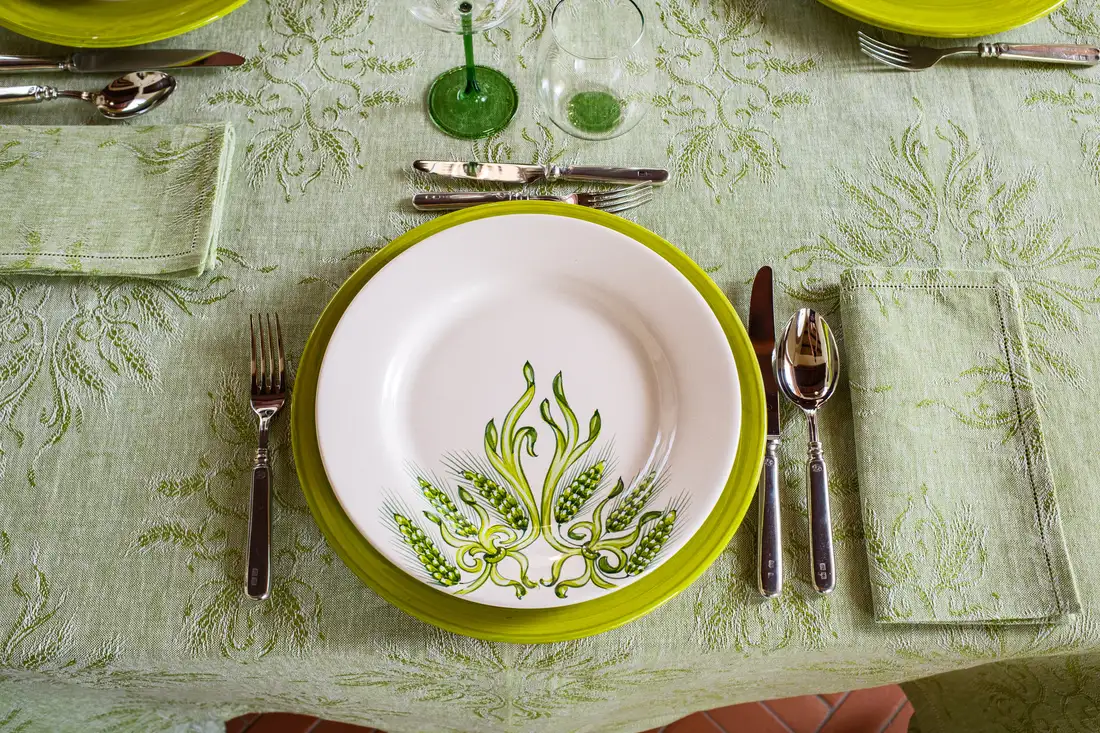 La perfetta simbiosi tra lino e ceramica è rappresentata da questa collezione che annulla il confine tra tessuto e materia: i colori e i disegni dei piatti dipinti a mano si fondono con la trama naturale della tovaglia in un gioco di specchi mozzafiato. Eleganti e sinuose spighe verdi tessute con la tecnica jacquard sono infatti perfettamente replicate sui piatti con un dettaglio quasi micrometrico. Eleganti bicchieri realizzati a mano e coordinati nel colore, completano questa collezione esaltandone il sapore estivo.