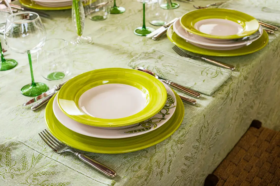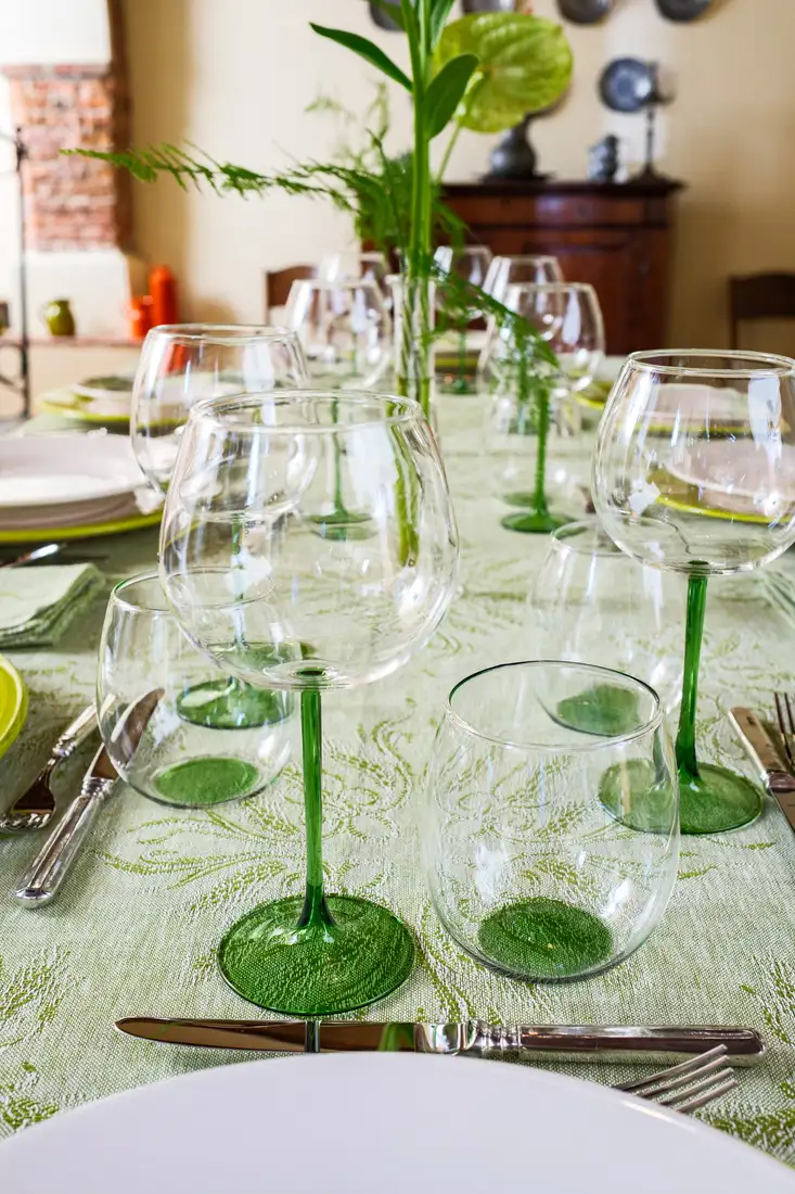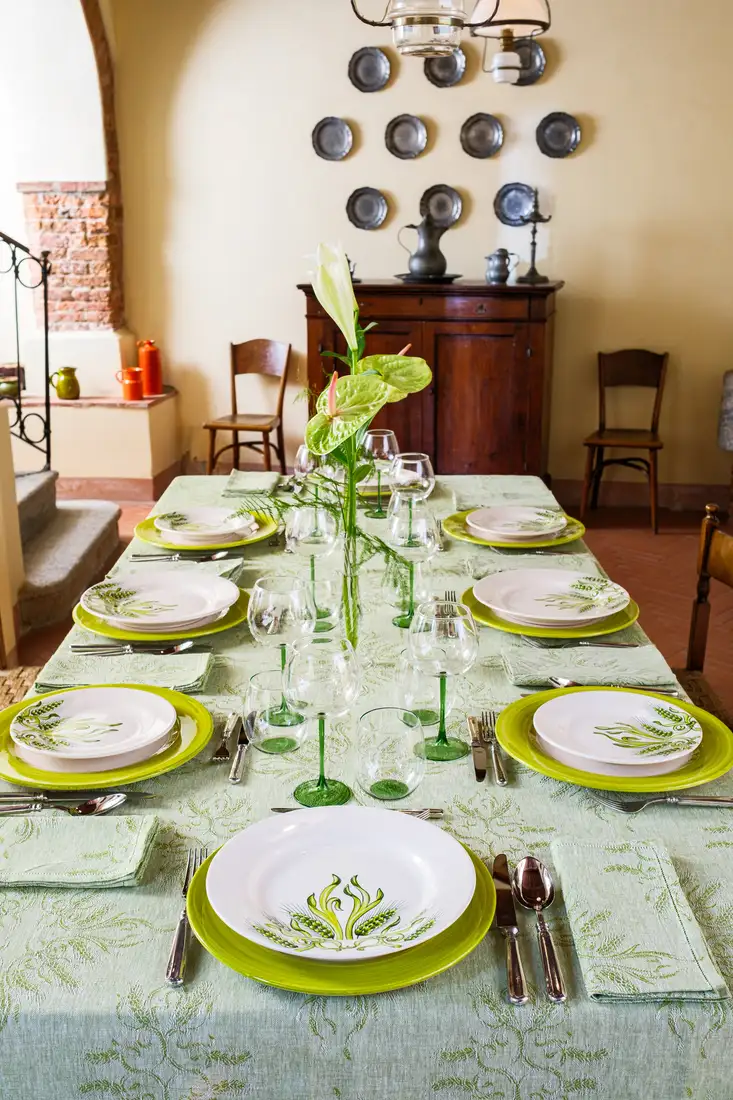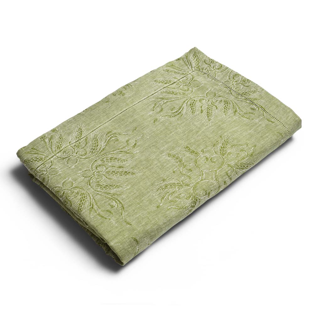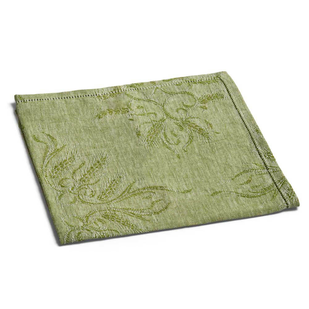 La perfetta simbiosi tra lino e ceramica è rappresentata da questa collezione che annulla il confine tra tessuto e materia: i colori e i disegni dei piatti dipinti a mano si fondono con la trama naturale della tovaglia in un gioco di specchi mozzafiato. Eleganti e sinuose spighe verdi tessute con la tecnica jacquard sono infatti perfettamente replicate sui piatti con un dettaglio quasi micrometrico. Eleganti bicchieri realizzati a mano e coordinati nel colore, completano questa collezione esaltandone il sapore estivo.