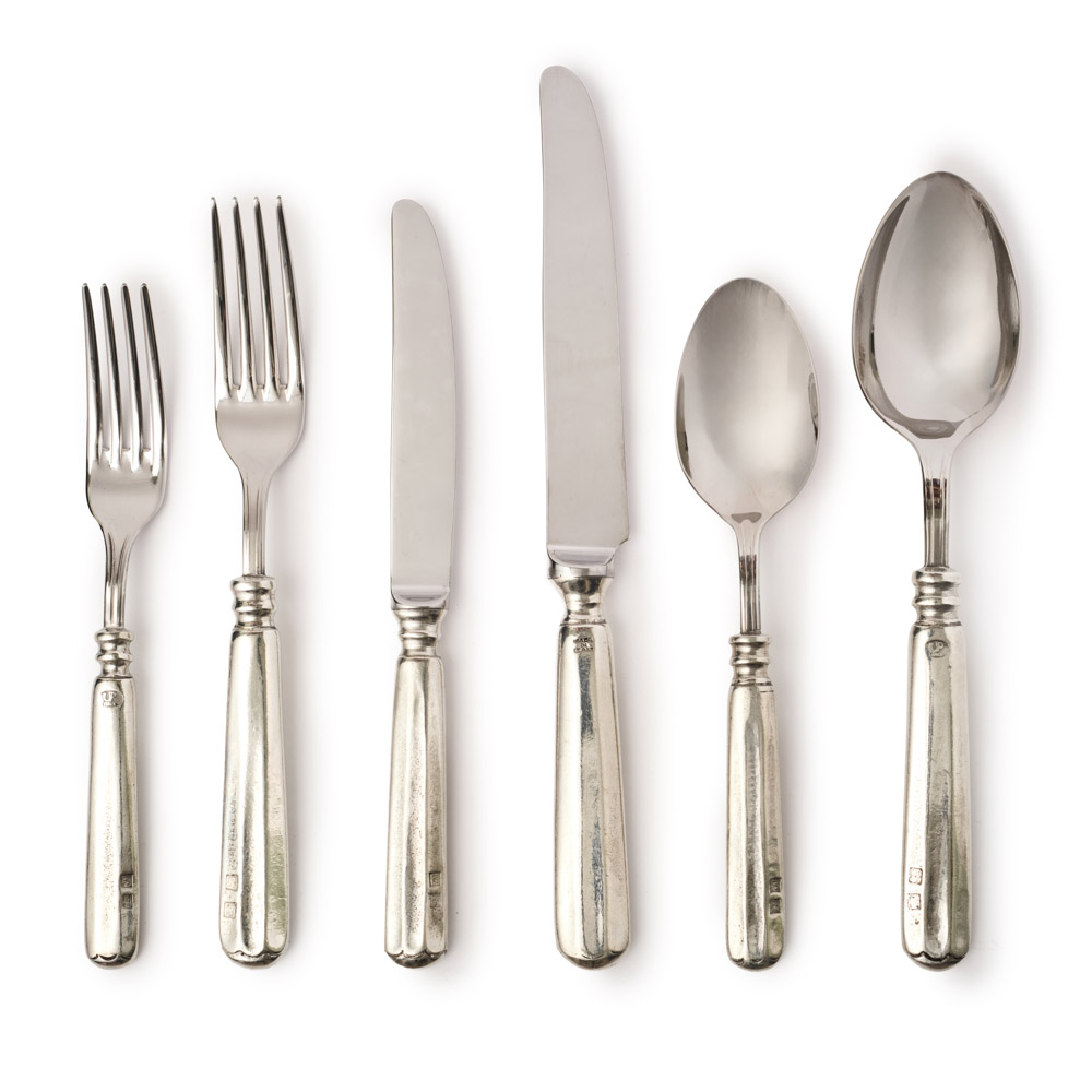 • Ogni posata รจ in acciaio inox con il manico in peltro realizzato interamente a mano in Italia per Emanuela Rossi di Marsciano dai piรน abili maestri peltrai lombardi.