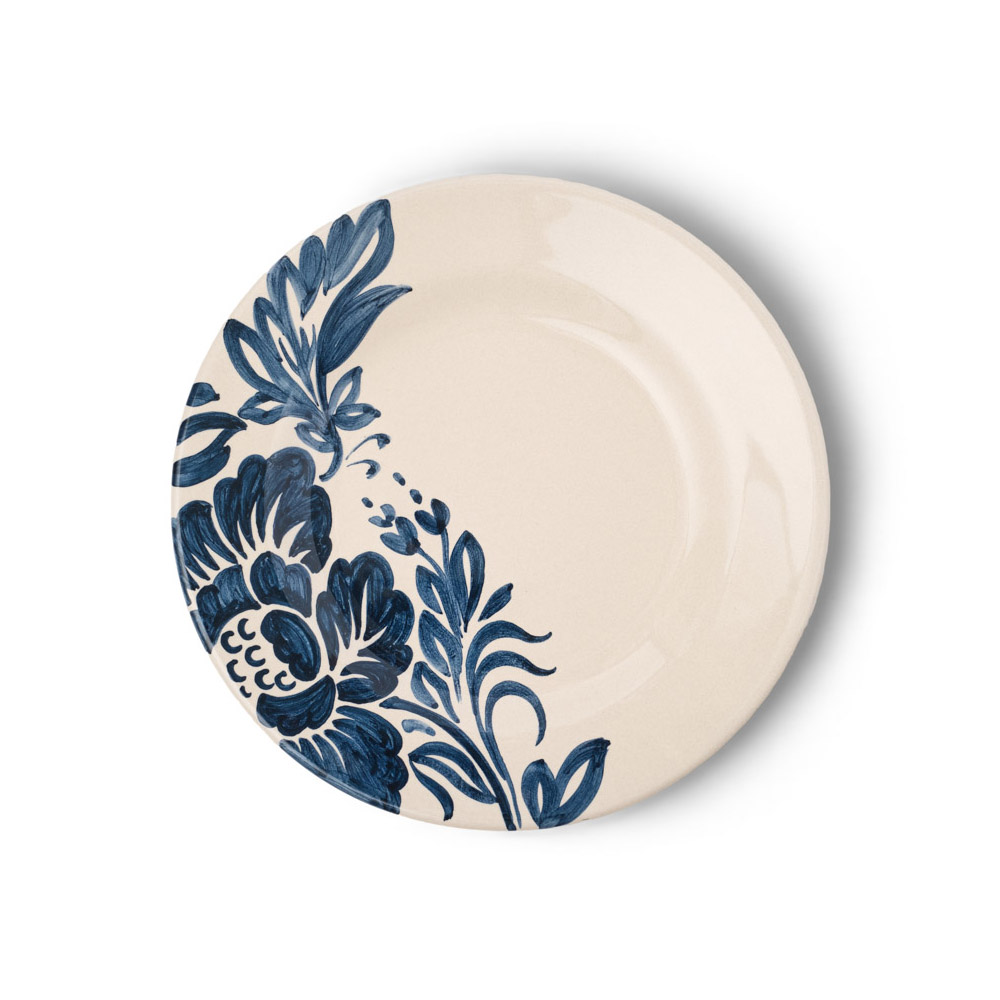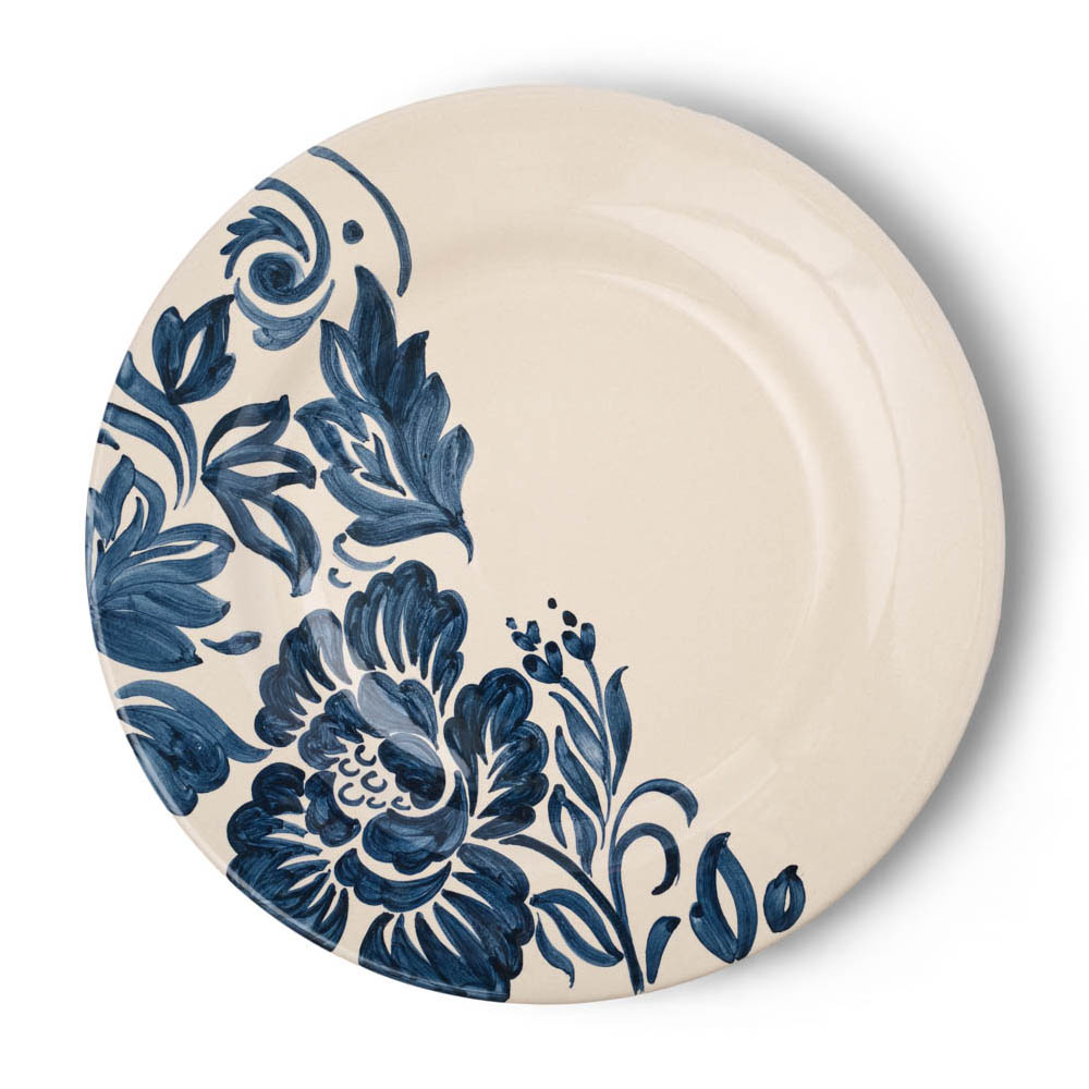 Eleganti fiori e armoniose foglie, ispirate ai giardini rinascimentali, adornano questi piatti in ceramica creando un effetto suggestivo nella variante di colore blu.
