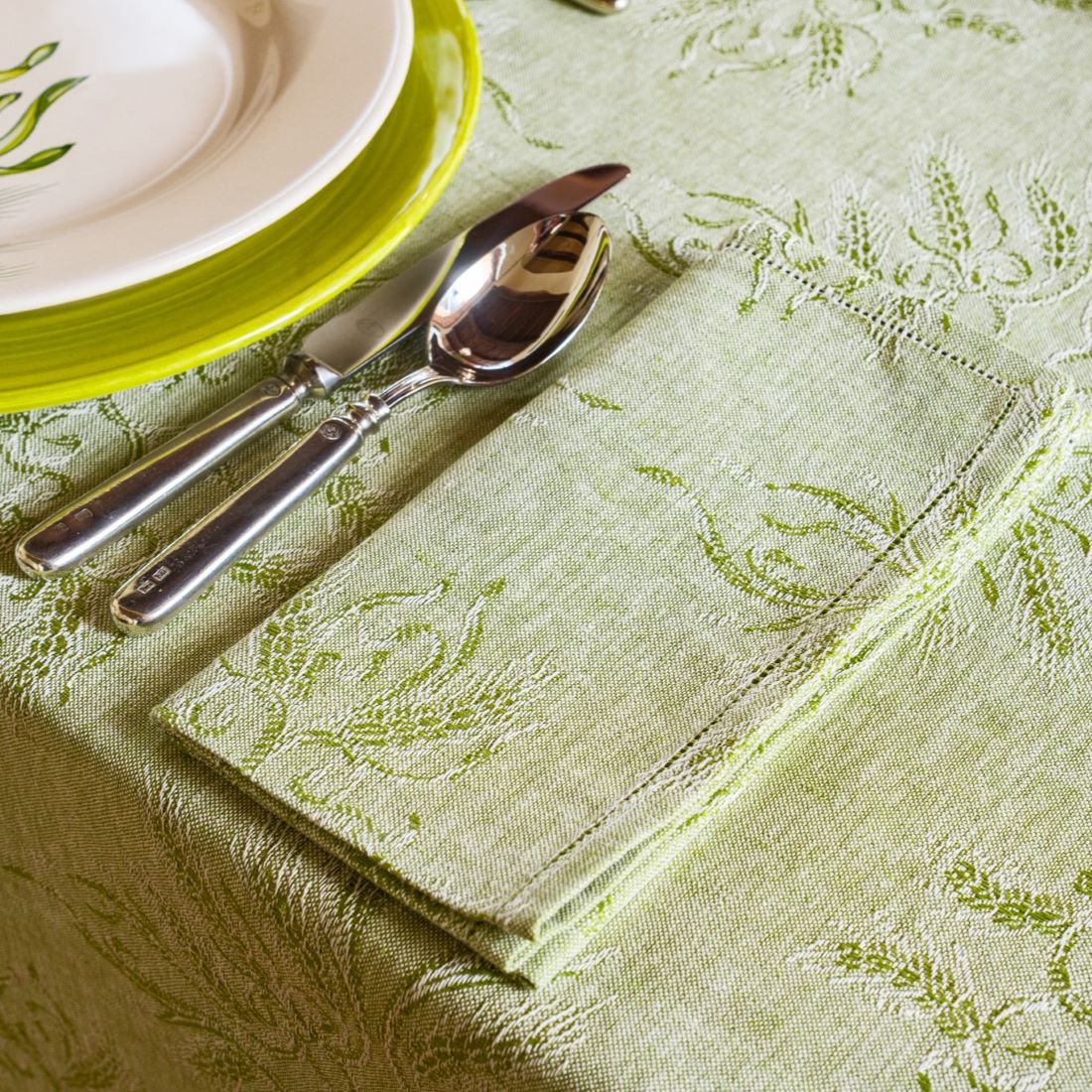 Eleganti e sinuose spighe sono tessute con la tecnica jacquard per tovaglioli verde prato dal sapore estivo.