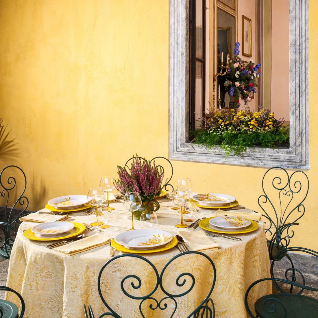 La tovaglia puรฒ essere abbinata ai piatti e bicchieri della stessa collezione, coordinandosi perfettamente per fantasia e colore, rivelando una raffinatezza senza tempo che trasforma ogni pasto in una occasione speciale.