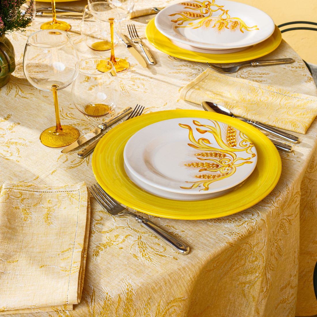 Eleganti e sinuose spighe sono tessute con la tecnica jacquard per una tovaglia color giallo senape dal sapore estivo.